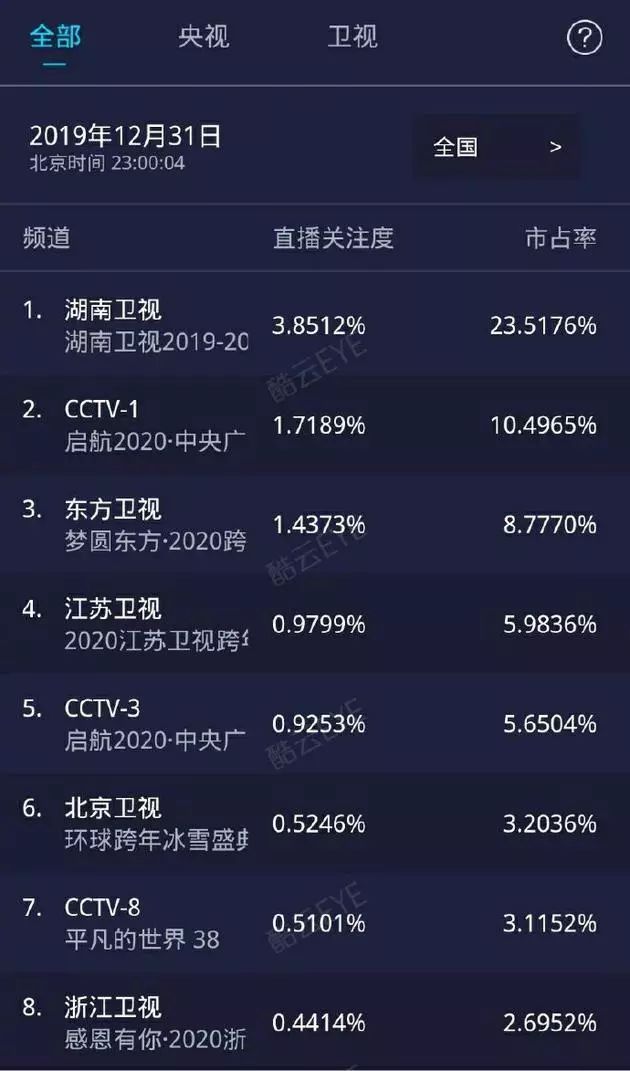 2019年12月31日晚,跨年晚会收视率排名出炉。湖南卫视跨年晚会以3.8%的直播关注度和23%的市场占有率勇夺第一桂冠,央视排第二,东方卫视和江苏卫视位列二三名。今年湖南卫视的跨年晚会众星云集,杨幂、腾格尔、杨紫、TFBOYS等艺人都带来精彩演出,谢娜也因“主持功力”登上微博热搜。
