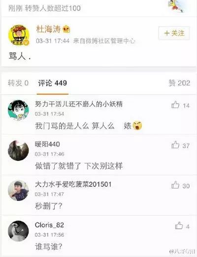 虽然没有多久就被杜海涛删除了,但是对于记仇的网友来说没那么容易忘记,况且这件事情是杜海涛做错事不道歉,还骂人..........这个情商高吗?