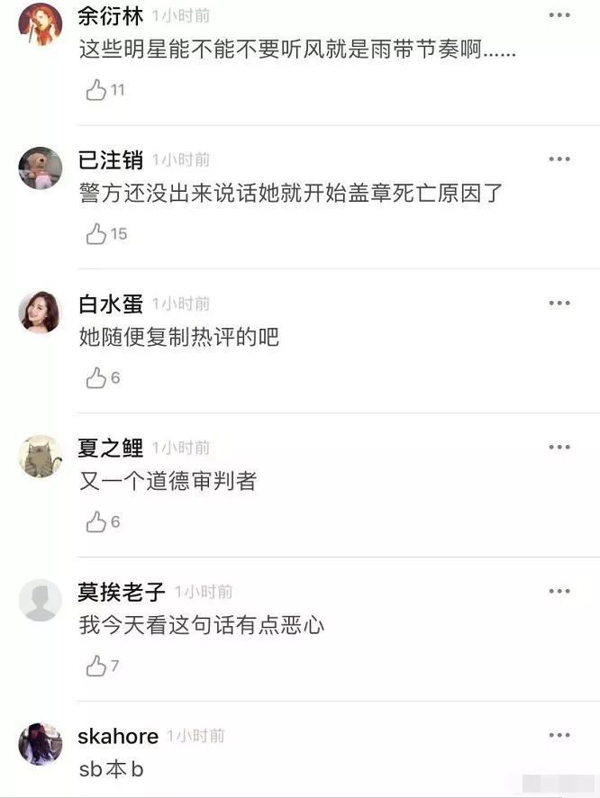 且不说这句话到底有什么问题没,就说她这听风就是雨的态度,官方都还没给出死因是啥,她就直接盖章是网络暴力了,这和当年谢楠在姚贝娜下病危的时候就发出悼念微博是不是一样的性质?