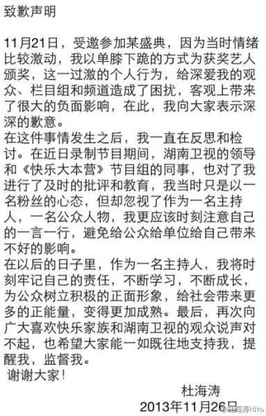 在13年一场颁奖典礼上,杜海涛作为主持人在给韩国明星权志龙颁奖时竟然当着一众明星的面在舞台上给权志龙下跪,在当时是引起不小风波。