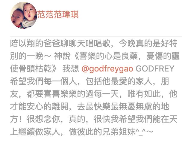 陪以翔的爸爸聊聊天唱唱歌,今晚真的是好特别的一晚~ 神说《喜乐的心是良药,忧伤的灵使骨头枯乾》 我想高以翔希望我们每一个人,包括他最爱的家人,朋友,都要喜喜乐乐的过每一天,唯有如此,他才能安心的离开,去最快乐最无忧无虑的地方!很想念你,真的,很快我希望我们能在天上继续做家人,做彼此的兄弟姐妹。