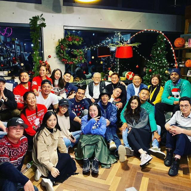 我想,这应该是高以翔生前朋友举行的聚会了。为了让高爸爸能够开心,举办的这场聚会。这次聚会大约有20多人,大家均是休闲打扮,里面有范玮琪黑人夫妇,一旁的应该是王力宏。大家伸出右手食指向右上方指去。