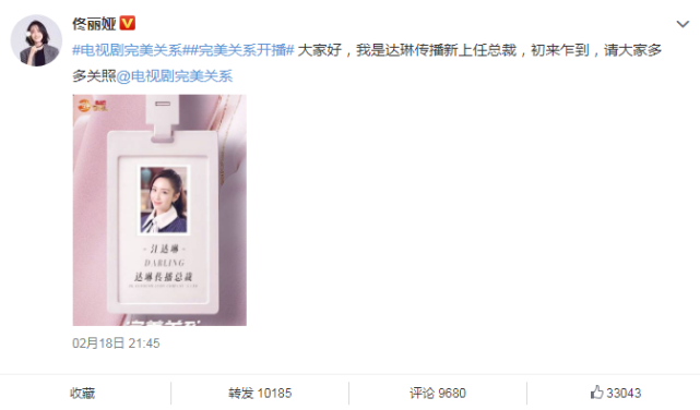 为了宣传自己的新剧,佟丽娅还在个人社交平台介绍自己: 大家好,我是达琳传播新上任总裁,初来乍到,请大家多多关照。并艾特新剧《完美关系》。如此卖力宣传,所以刚播出就备受关注。