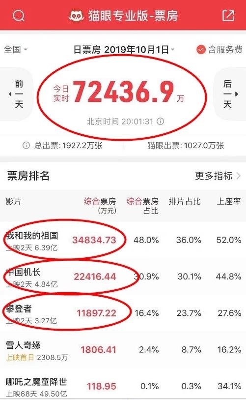 在国庆假期首日,大盘同样高企,截止到10月1日20时,单日票房已经突破7.2亿大关。