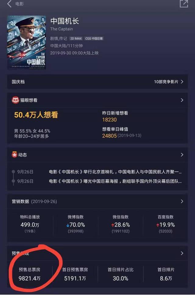 从最初的预售开始《中国机长》就是屈居第三,七星连珠七位导演合力拍摄的《我和我的祖国》1.7亿,百亿影帝吴京《攀登者》1.3亿,而张涵予的《中国机长》仅有9000万。