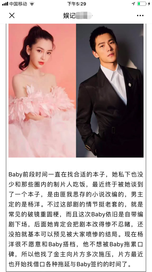1月13日,一名八卦公号作者爆料称不缺资源的Baby最近又到手了一部由大IP小说改编的剧本,现定的男主是杨洋,杨洋十分担心会被Baby拖累口碑,所以不断地向片方施压拒绝和Baby合作,为难的片方现在也在找各种借口拖延和Baby签约。