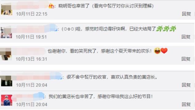 一开始因为剪辑和不了解的原因,观众都纷纷吐槽黄晓明,但到了最后收官的时候,网友却纷纷表示“感谢这个夏天带来的欢乐”、“感谢黄店长带来这么好的节目”、“看完中餐厅对你从讨厌到理解”。