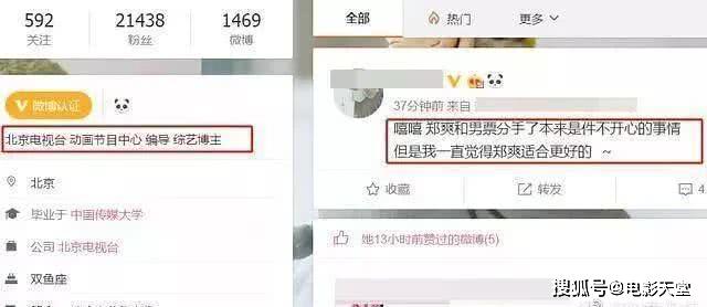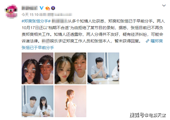 也是在那个时候,郑爽和张恒分手的消息开始在网上不断发酵,再加上认证信息为某电视台编导的用户透露郑爽张恒已经分手的消息,更让两人分手的真相呼之欲出。但是对于分手这件事,两人倒是非常低调,时隔这么久谁都没有回应。