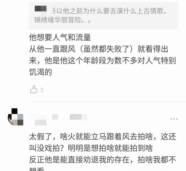 网友们也说,他想要人气和流量,从他一直跟风就看得出来,他是他这个年龄段为数不多对人气特别饥渴的。而且比他风评好演技好的大有人在 比他年轻比他帅的更一把一把的,没准人价钱还便宜,没戏找他还挺正常的。