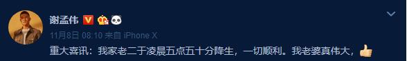 11月8日一大早,“嘎子哥”谢孟伟就迫不及待地在微博上表白老婆,直呼“老婆真伟大”,原来他们家老二在凌晨五点五十分降生了,小谢谢当哥哥啦!
