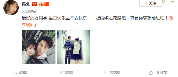 在娱乐圈内,由于一些明星大多毕业于影视院校,所以也是同学不少。比如杨紫和张一山是同学,其实两人的同学还有如李现等。最近,杨紫为老同学李现庆生,称“最好的老同学,生日快乐,平安快乐,一起继续走花路吧”等等。