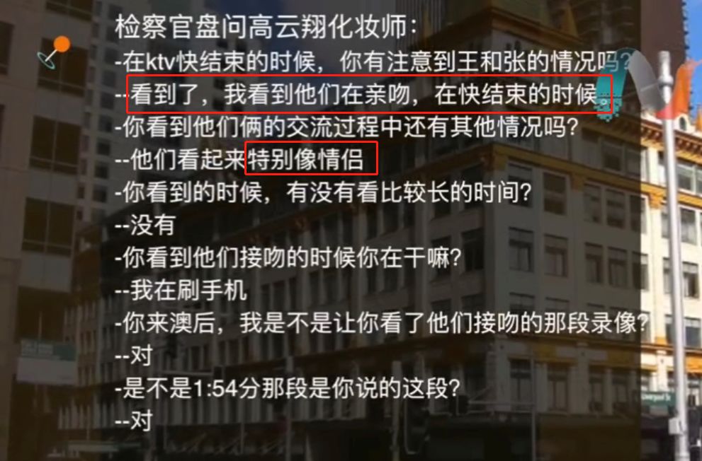 化妆师也确认,她所说的这段亲吻,就是来澳洲后检方给看的监控录像中的那段亲吻。随后王晶的律师询问了化妆师, 确认化妆师所说的亲吻,是两人嘴对嘴亲吻,并不是亲脸颊。化妆师坦言:“我没有看到女方把王晶推开,我觉得我作为一个成年女性,能感觉到他们像正常情侣一样。”