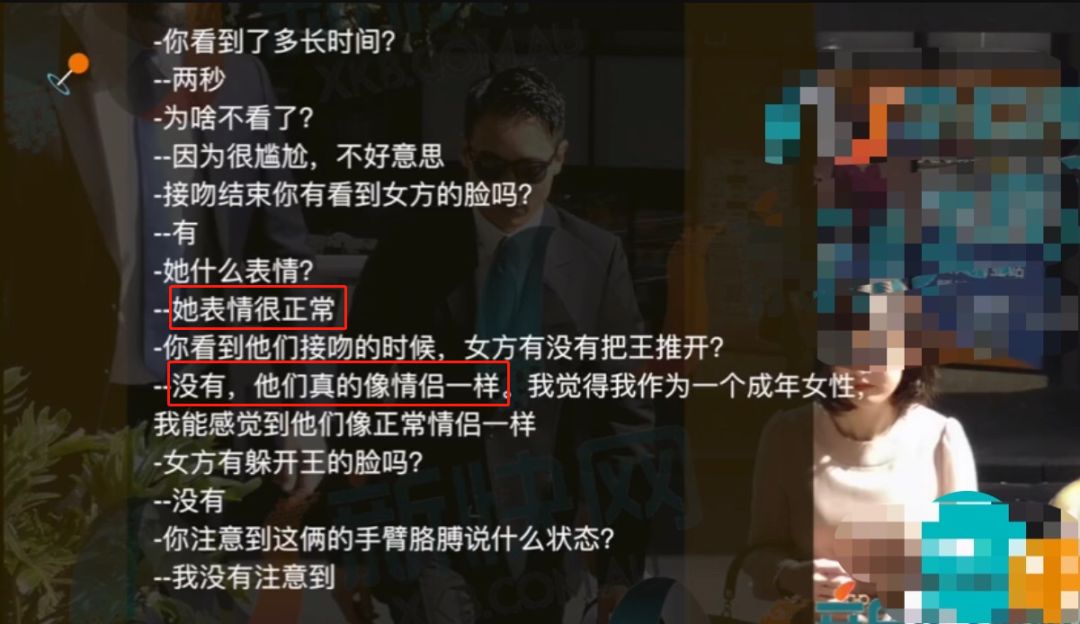 女证人还强调自己看到他们的亲密举动时,并没有转开脸,言下之意是看得很清楚,她称女当事人和王晶的表情都很享受,女当事人也没有别开脸或者拒绝。另外一位证人的证词也和前两位如出一辙,3个证人一齐指认,案发当晚在KTV,女当事人和王晶做出了亲吻的举动,并且女当事人没有反抗,还十分享受。