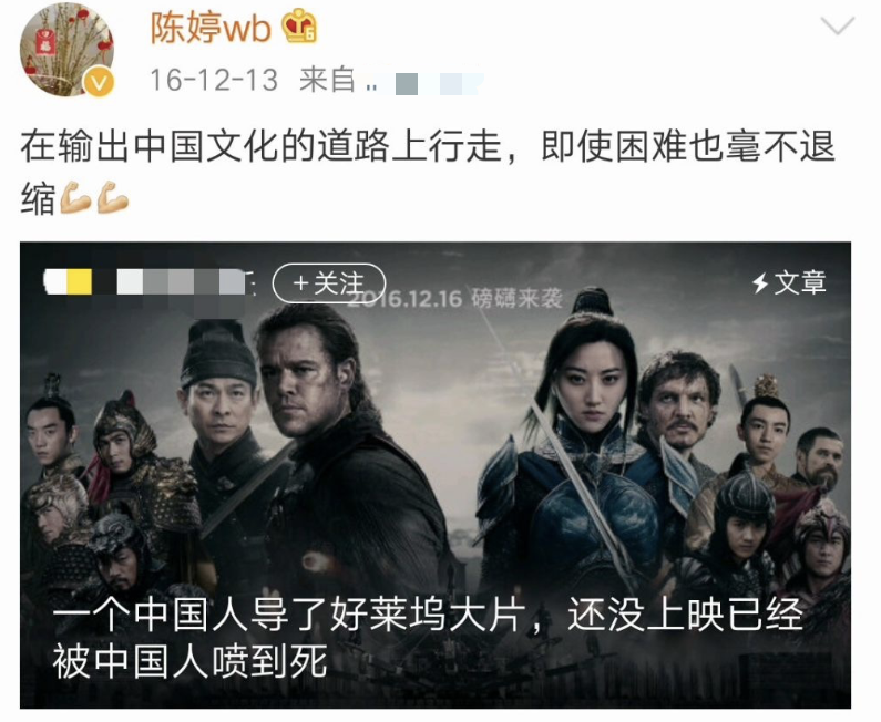 其实,这并不是陈婷第一次为张艺谋发声了。早在2016年,陈婷也曾霸气护夫过。当时张艺谋正在拍摄《长城》,可是外界却有传言张艺谋已经逝世,作为妻子,陈婷怎么能忍受丈夫去世谣言,于是公开发文支持张艺谋新片,并怒怼传谣者。