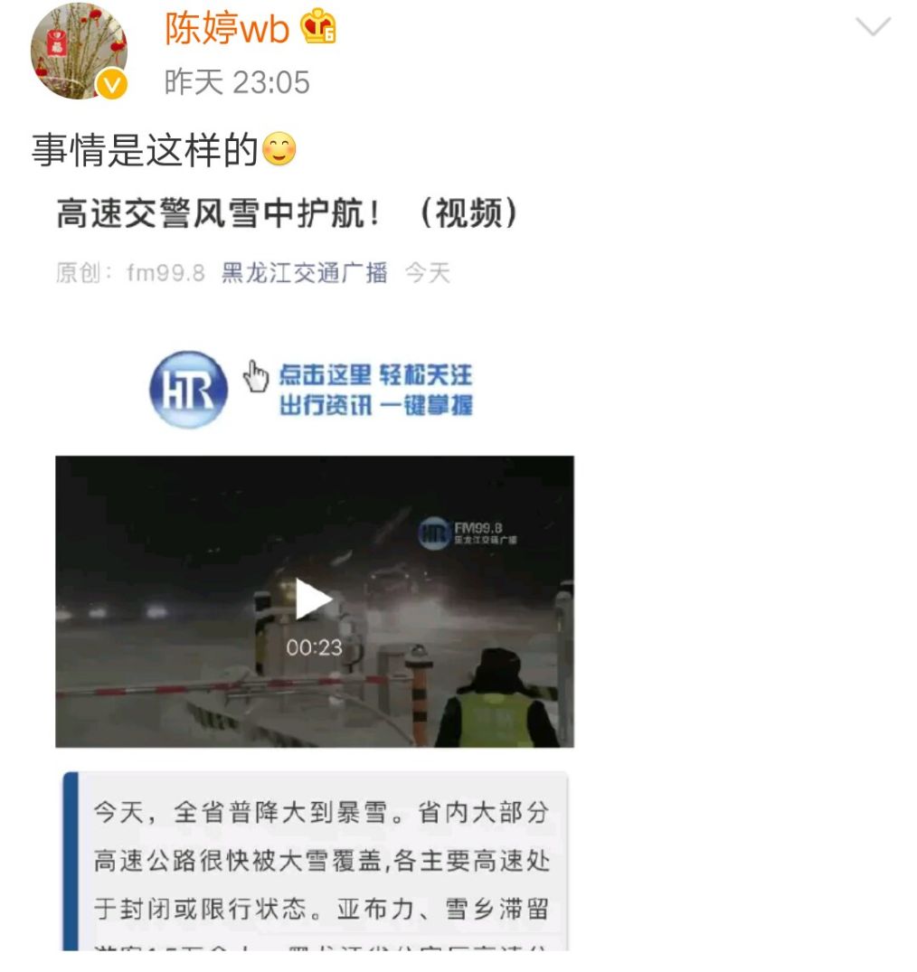 张艺谋的名誉受损,作为妻子,陈婷当然没有坐以待毙。对此,陈婷马上又在微博发文“请看后面一条微博,交警在大风大雪天气下平安护送了1.5万人,我们只是其中几个而已”,她还晒出了当地的一条新闻做解释,由于暴雪原因导致大量游客滞留,除了他们一家人之外,很多滞留游客都由交警护送至哈尔滨,并不是因为所谓的"搞特权"。