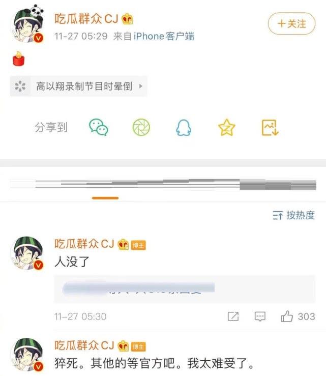 事情发生后,各家媒体都在紧急联系高以翔方,但是没有得到答复。现场观众口述,高以翔晕倒时其他几位嘉宾纷纷围在他的身边帮忙,其经纪人失声痛哭,让人心酸。据知名博主透露,高以翔在医院抢救无效去世,属于猝死。