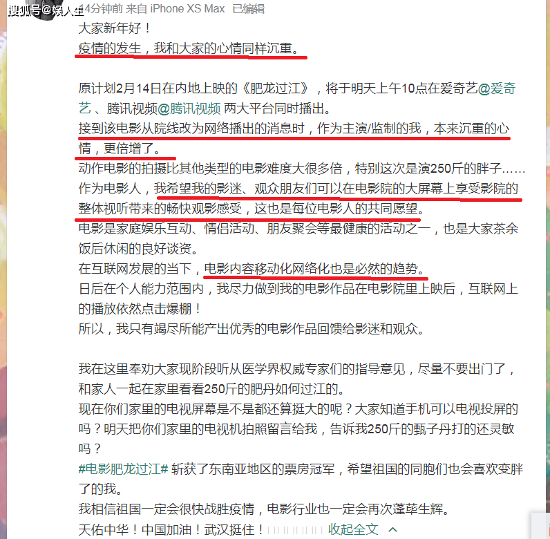 疫情发生,甄子丹自言心情很沉重,当“接到该电影从院线改为网络播出的消息时,作为主演/监制的我,本来沉重的心情,更倍增了。”
