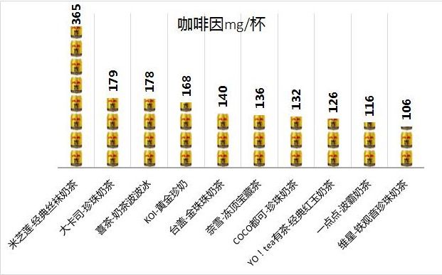 深圳市光明区消费者委员会、深圳市食品药品安全志愿服务总队开展珍珠奶茶比较试验发现,喜茶、奈雪の茶、台盖、YO!Tea有茶、COCO都可、一点点、KOI、维星、大卡司、米芝莲十个品牌奶茶均被检出含有咖啡因,平均含量为258mg/kg。其中米芝莲-经典丝袜奶茶咖啡因含量最高,为522mg/kg,1杯该奶茶的咖啡因含量相当于7罐红牛的咖啡因总量。