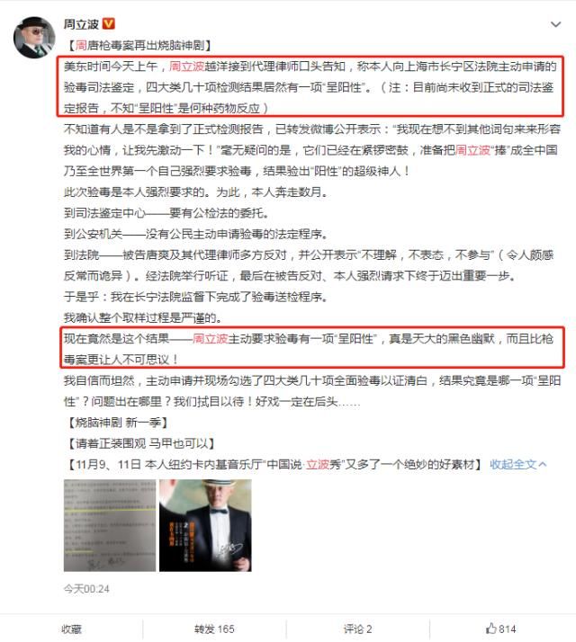24日,周立波发文称律师通知自己验毒司法鉴定中有一项呈阳性。这次验毒与2017年的"美国吸毒案"有关。当时周立波开车被警察截停,查出车内藏有枪支和毒品。周立波表示遭人陷害,副驾驶唐爽也参与其中,唐爽与周立波随后开始骂战。
