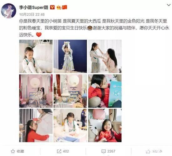 10月23日是甜馨7岁的生日,晚上李小璐在闺蜜董璇的亲子餐厅为女儿举办了生日派对庆生。照片中,甜馨以一身水蓝色裙子亮相,可爱又淑女,还邀请了不少同学,一同开心唱歌,场面很是热闹。李小璐身穿一袭白色连衣裙上台致辞,优雅不失女人味。