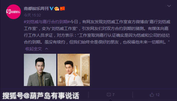 10月25日,有细心的网友发现,刘恺威工作室的名称发生了变更,原本的“嘉行刘恺威工作室”变成了“刘恺威工作室”,刘恺威是否已经离开嘉行传媒,也成了大家关心和热议的话题,对于此次变更有媒体联系到嘉行传媒,对方确认与刘恺威的合约已经到期。