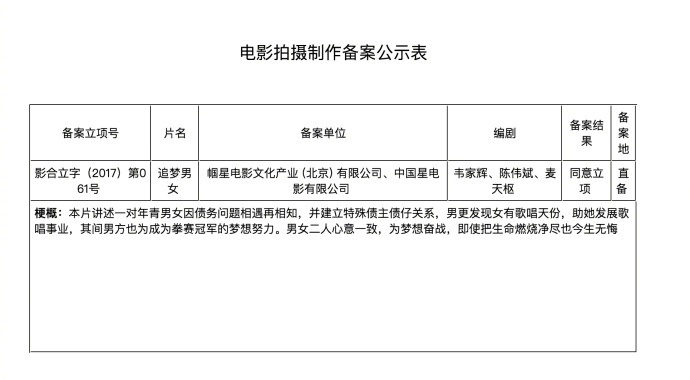 从当时立项的制作备案公示表也能看到,编剧是韦家辉,投资是中国星及中国星投资的帼星电影。最初的梗概是讲述一对青年男女因债务问题相遇相知,并建立特殊债主债仔关系,男助力女方发展歌唱事业,期间男方也为成为拳赛冠军的梦想努力。
