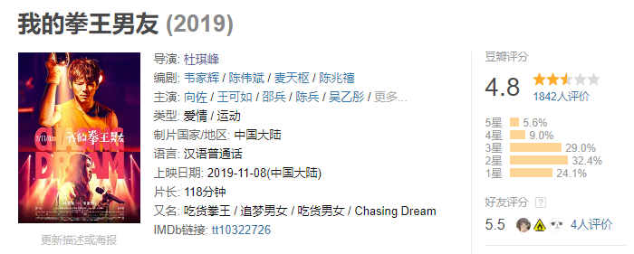 同时,电影口碑并不理想,目前豆瓣评分仅4.8,说明绝大多数观众对电影都不满意。《我的拳王男友》由向华强、向太掌门的中国星投资,其目的显然是捧自己的儿子向佐,同时拉杜琪峰入局,再用拳击的动作元素赚一笔票房,没想到最后没有名利双收,而是鸡飞蛋打。