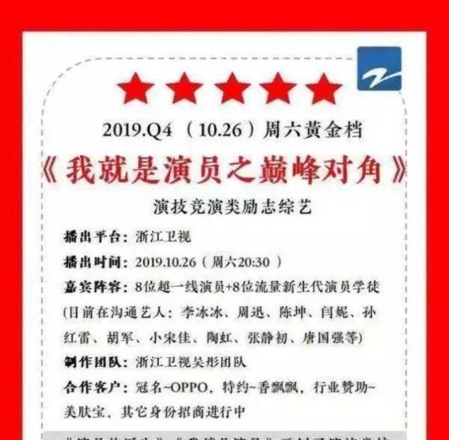 至于浙江卫视的《演员的诞生》,第三季正式更名为《我就是演员之巅峰对角》,从节目组的对外招商文件中可以看出,将接档《各位游客请注意》于Q4播出。