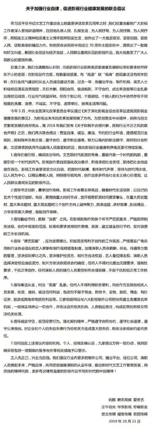 就目前来说,行业确实还未完全“回暖”,但已越发理性化与人性化。10月22日,6大影视公司联合3大平台发起的联合倡议,提出加强演职人员在薪酬、排名、待遇方面的管理,禁止个人干预番位排名和选角,否则将被影视公司和平台联合抵制。