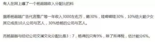 比如“锦鲤”杨超越,由于与腾讯深度捆绑,代言、综艺、影视资源接到手软,媒体爆料杨超越广告代言推广等一年收入达三千万,但经过腾讯、哇唧唧哇、火箭少女成员及公司、闻澜文化等逐级分成,实际到杨超越手中的仅6%左右。