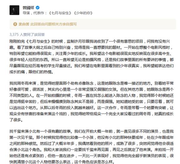 10月25日,《少年的你》上映首日拿到1.48亿元票房,口碑非常好:豆瓣8.7分,猫眼9.7分,淘票票9.6分。片中两位主演周冬雨和易烊千玺的表演也赢得了众多观众的肯定。当天下午,该片导演曾国祥在网上发文解释了自己拍这部电影的初衷,以及为何选周冬雨和易烊千玺来演,他认为周冬雨“带给观众一个完全没看过的周冬雨,她真的成长很多”,易烊千玺“完全超乎新演员的表现”。