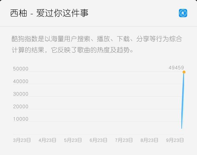 9月20日,西柚演绎的《爱过你这件事》独家上线酷狗,引发收听热潮。短短几天内酷狗指数直线上升,逼近5万!更是荣登酷狗TOP500排行榜,势头相当猛!