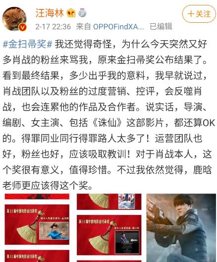 其实肖战这些年入行出道后一直很努力,从歌手转到演员绝对付出了不少,也尝了不少辛酸。大家在《陈情令》已经看到他的表现了,绝大多数观众还是认可肖战的演技的。其实获得差评的奖项,这未必是一件坏事,特别对于当红的明星来说,无疑是良药苦口利于病。有了次的教训,相信他的团队以后会更认真的挑选剧本和班底,为粉丝和观众手机电影网呈现更好的作品,打好路人缘。