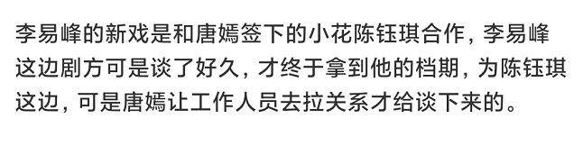 除去这三部已知作品外,网络上还流传着陈钰琪可能会与李易峰合作的消息。有媒体号爆料,电视剧《镜双城》5月份开机,签约陈钰琪为女主,而且这其中离不开唐嫣的助力,相传剧组正在洽谈李易峰,如果传闻属实的话,那么这样帅男靓女的组合当真太养眼了。
