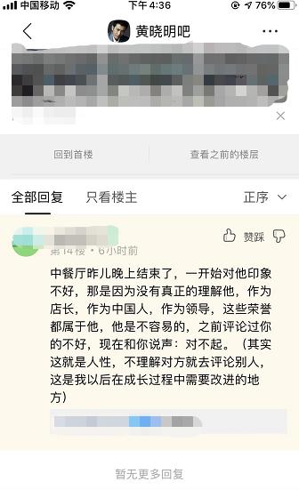 不过小编也慢慢发现,随着节目的收官,不少之前持偏激观点的网友对黄晓明的态度出现了转变,更有观众在黄晓明吧为之前自己的言论表示抱歉,称“一开始对他印象不好,那是因为没有真正的理解他”。