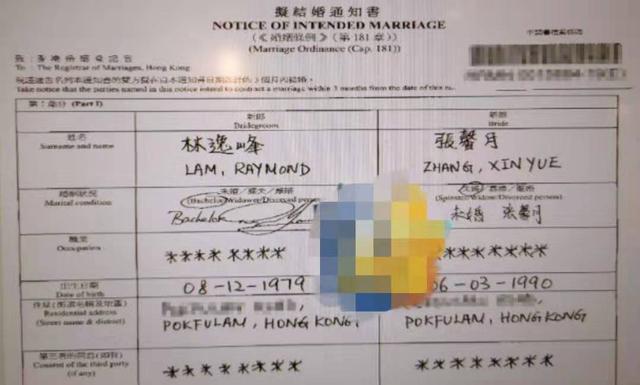 在这张通知书中我们能够清楚地看到林峯以他的本名林逸峰入纸,而张馨月的出生日期写着是1990年3月6日,与网上所显示的1990年9月18日有出入,相差了半年的时间,不过二人的所填的住址是一样的,都是写着薄扶林,看来张馨月已经搬到了林峯在2015年以逾6千万购入的薄扶林嘉林阁复式单位共筑爱巢了。