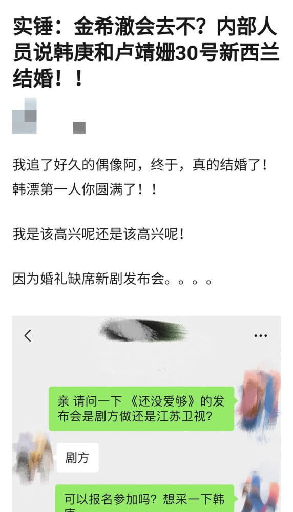 27日有网友爆料称韩庚卢靖姗将要在30号于新西兰举行婚礼,韩庚的新剧发布会即将召开,然而韩庚本人会缺席这次发布会的原因就是在筹备自己的婚礼。该网友声称内部人员给出的回应,还在猜测金希澈是否会参加他的婚礼。