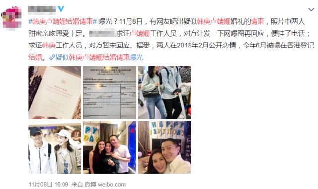 早在11月份曾有网友晒出了疑似韩庚与卢靖姗的婚礼请柬,封面两个人的名字异常明显,贴面热吻的照片也十足吸睛,有细心的网友发现上面婚礼的日期正是12月份,当时还有媒体对韩庚工作人员进行求证,对方挂断了电话,几天后卢靖姗出席活动时回应称有喜事一定会跟大家分享。