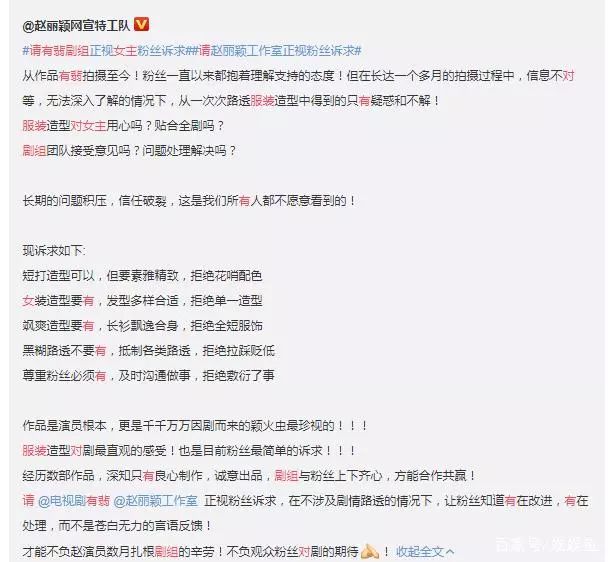 赵丽颖对《有翡》剧方的不满,并非空穴来风。赵丽颖微博发布后,其全球粉丝后援会官博便发文,指出对剧方的不满,包括:尊重女主地位,包括但不限于服化道;拒绝注水魔改,保证作品质量。