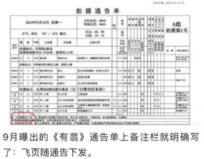 但从9月份《有翡》开机初期网上传出的通告单,可以看到备注栏明确标注了:“飞页随通告下发”。也就是说,该剧并没有完整的剧本,配角随身携带编剧,飞页拍摄。