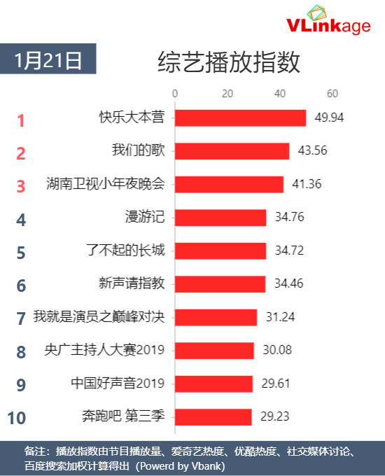 【综艺榜单】1月21日当日#综艺播放指数#:1.#快乐大本营# 播放指数 49.94 2.#我们的歌# 3.#湖南卫视小年夜晚会# 4.#漫游记# 5.#了不起的长城# 6.#新声请指教# 7.#我就是演员之巅峰对决# 8.#央广主持人大赛2019# 9.#中国好声音2019# 10.#奔跑吧 第三季#