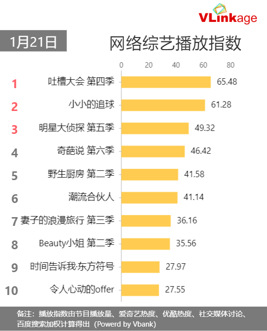 【网综榜单】1月21日当日#网络综艺播放指数#:1.#吐槽大会 第四季# 播放指数 65.48 2.#小小的追球# 3.#明星大侦探 第五季# 4.#奇葩说 第六季# 5.#野生厨房 第二季# 6.#潮流合伙人# 7.#妻子的浪漫旅行 第三季# 8.#Beauty小姐 第二季# 9.#时间告诉我·东方符号# 10.#令人心动的offer#