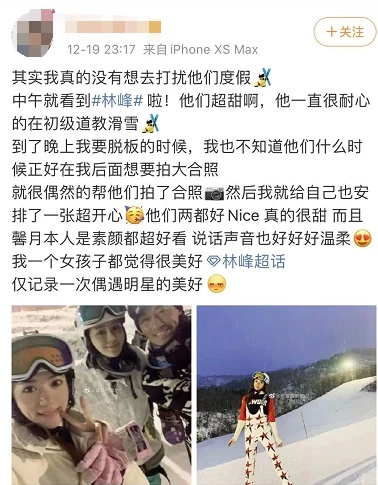 有粉丝留言问林峯有没有陪同一起去,虽然张馨月没有回复,但她与林峯的“行踪”很快就被偶遇的路人暴露了。
