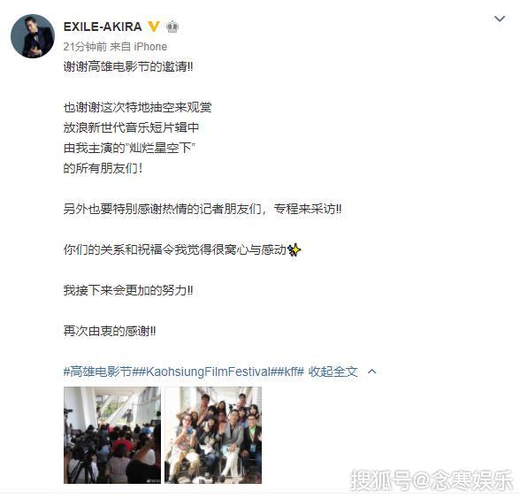 塞翁失马焉知非福,马到成功何为不春。15日下午,日本知名男星黑泽良平通过微博,晒出了自己参加高雄电影节的照片,并用中文两次致谢节目组的盛情邀请,感谢前来支持他作品的朋友,表示今后一定会更加努力。