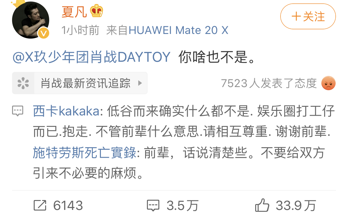 并没有说因为他红了就飘了,反而是更加的谦逊谨慎了,也确实应该如此。毕竟,在娱乐圈这个地方,三十年河东三十年河西,谁知道以后会是什么样子呢?可是,肖战红是真的红,关注度和曝光率都很高,不知道是不是因为这样,从而让有一些人不满。演员夏凡在微博中突然艾特了肖战,并表示:你啥也不是。这种操作也是让人一头雾水,还瞬间登上了热搜。