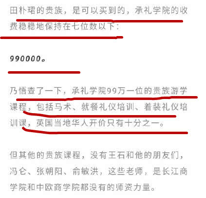 但田朴珺只不过是一个依附于大亨处处想出名获利成为上流社会的演艺人,真正的贵族首先是有责任有担当,精神富足独立,有学识有教养又见识,然后是富有,家族积累和传承。但田朴珺貌似觉得自己已经完全掌握了这些,而且学费也是不菲,一年99万,不论教的怎么样,这个学费是够贵族的待遇了。