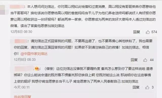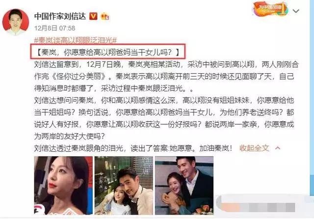 12月8日,自称作家的刘信达发表微博称:“刘信达想问问秦岚,你和高以翔感情这么深,高以翔没有姐姐妹妹,你愿意给他当干姐姐吗?换句话说,你愿意给高以翔爸妈当干女儿,为他们养老送终吗?都说好人有好报,你愿意让高以翔收获这一份好报吗?都说两岸一家亲,你愿意成为两岸的友好大使吗?刘信达透过秦岚眼角的泪光,读出了答案:她愿意。加油秦岚!”