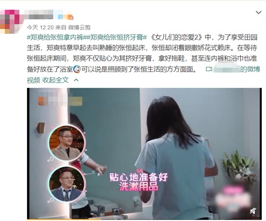 该节目其中一个片段就是:为了享受田园生活,郑爽特意早起去叫熟睡的张恒起床,张恒却闭着眼撒娇花式赖床。在等待张恒起床期间,郑爽不仅贴心为其挤好牙膏,拿好拖鞋,甚至连内裤和浴巾也准备好放在了浴室,可以说是照顾到了张恒生活的方方面面。难以想象曾经因为受到一点网上的负评就对着粉丝发飙的郑爽,怎么到了张恒面前会乖巧得像个小猫咪呢?