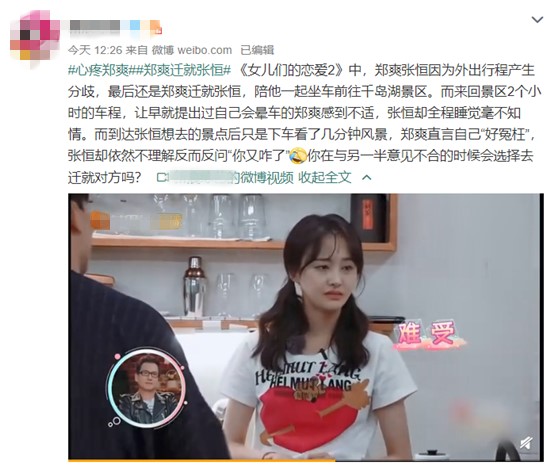 之后就是张恒提议坐车去千岛湖景区游玩,郑爽却明确表示全都是山道可能会晕车,张恒依然坚持说:“你可以坐第一排”,也没有在意郑爽说喝了豆浆再吹风可能会拉肚子的解释,而是直接丢下一句“你提吧,反正我提的都被否决了”,便丢下郑爽走出门去。最终就是郑爽妥协,而来回景区2个小时的车程,让早就提出过自己会晕车的郑爽感到不适,张恒却全程睡觉毫不知情。而到达张恒想去的景点后只是下车看了几分钟风景,郑爽直言自己“好冤枉”,张恒却依然不理解反而反问“你又咋了?”
