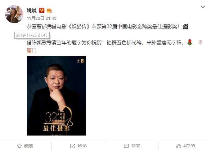 曹郁是摄影师并凭借《妖猫传》摘得本届金鸡最佳摄影奖!